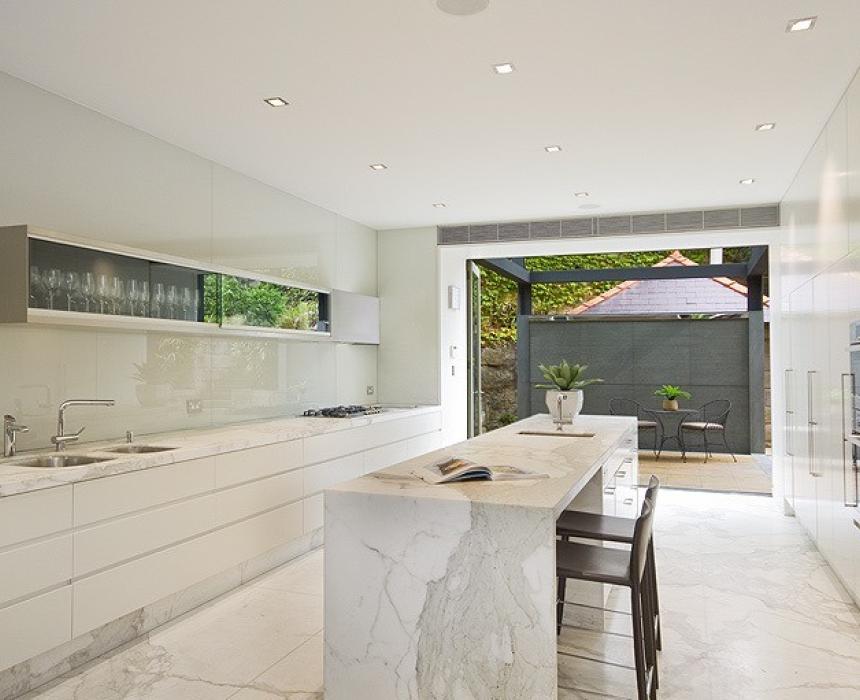 This Hunters Hill heritage-listed property was a renovation with a newly located kitchen on the floor plans. Salt Interiors worked with the client and architect to create a modern but classic kitchen with Carrara marble bench tops, profile kitchen doors and glass splash backs.